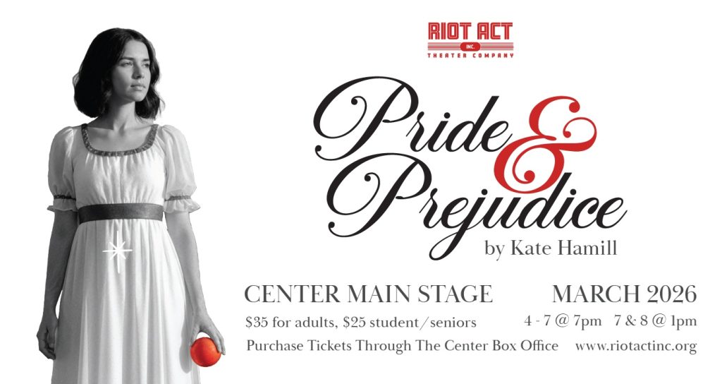 Riot Act, Inc. proudly presents Pride and Prejudice by Kate Hamill on The Center for the Arts Main Stage. Performances run March 4–7 at 7:00 PM, with matinees on March 7 and 8 at 1:00 PM.